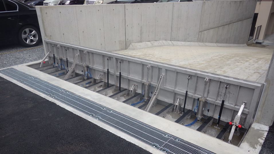 浸水してくる水の浮力を利用して、全自動で起伏する防水板。