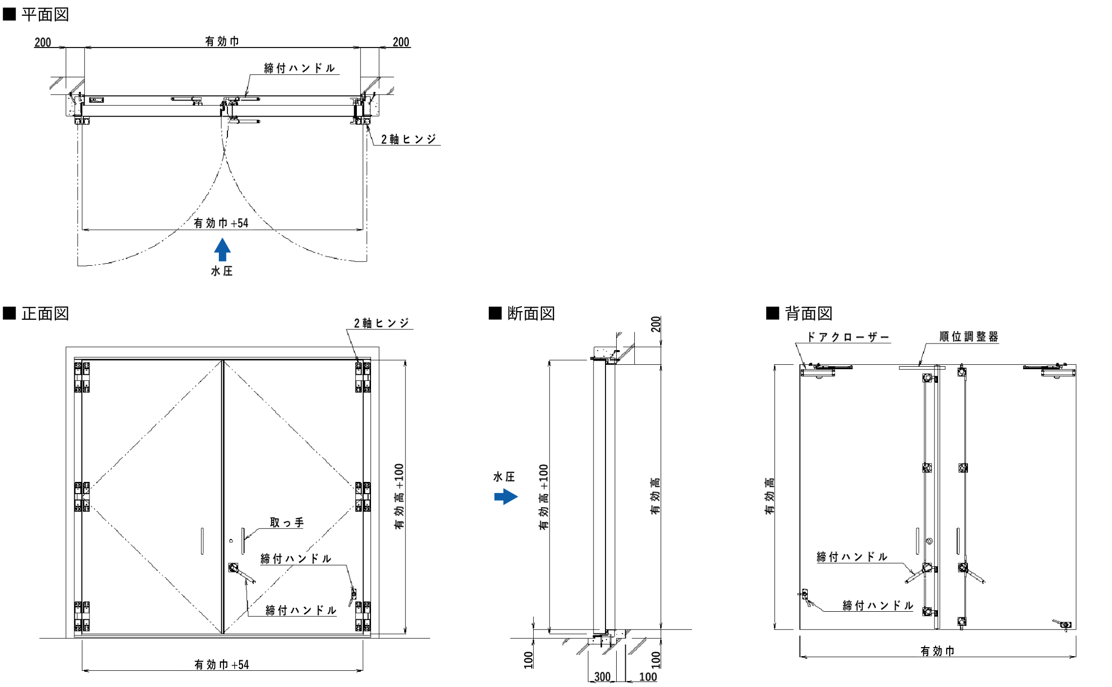 | 材質 | 扉体 :SS400(SUS304対応可能) 戸枠 :SEHC(沓摺SUS304) ※SUS304対応可能 止水ゴム:EPDM |
