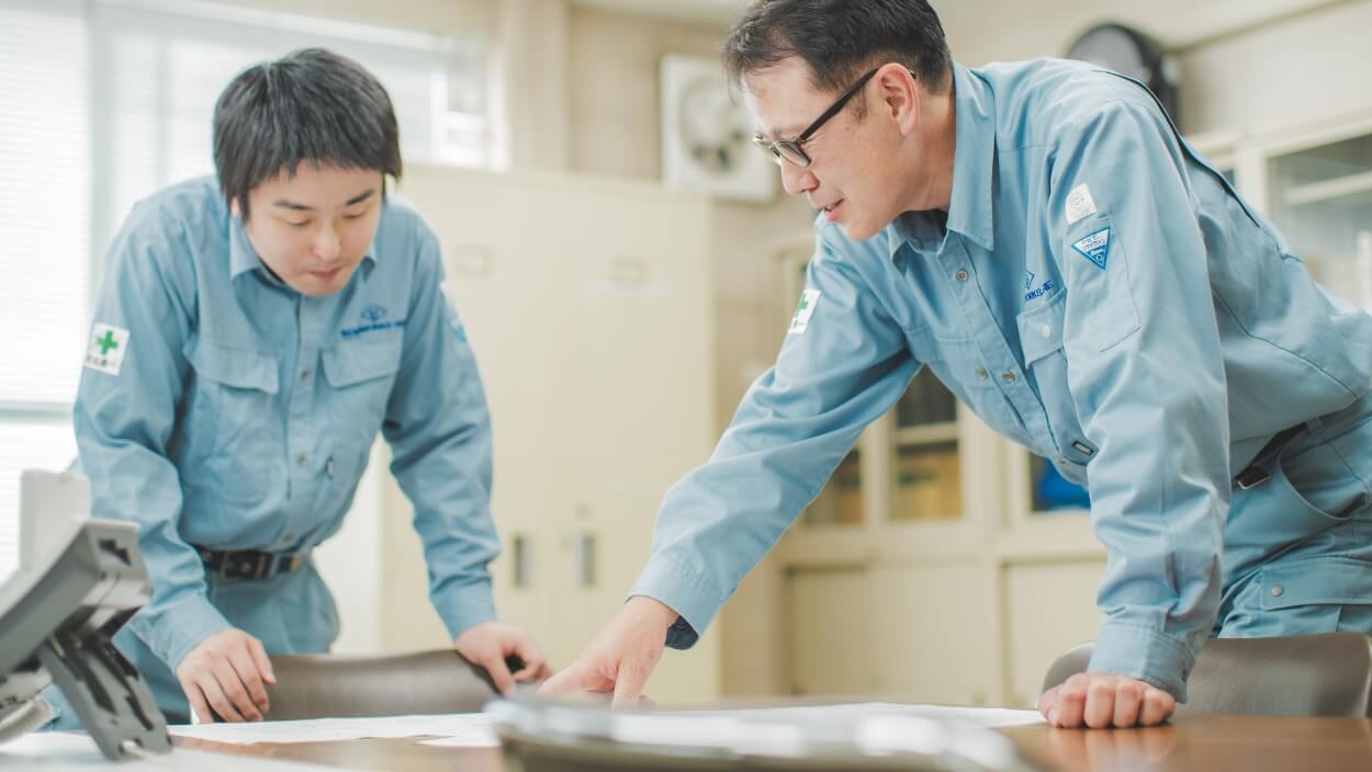 工事の仕事は、新規据付から既存製品の点検・修繕などの工事計画を立案後、工程表を作成して、外注業者協力のもと工事を完成に導きます。数十年にわたって製品の性能を十分発揮させるため、「正しく現地に設置すること」を心がけています。